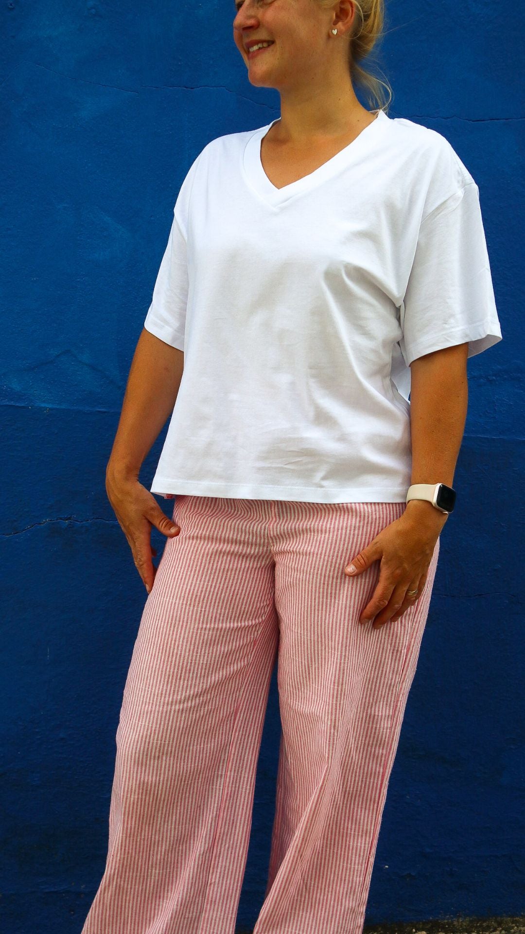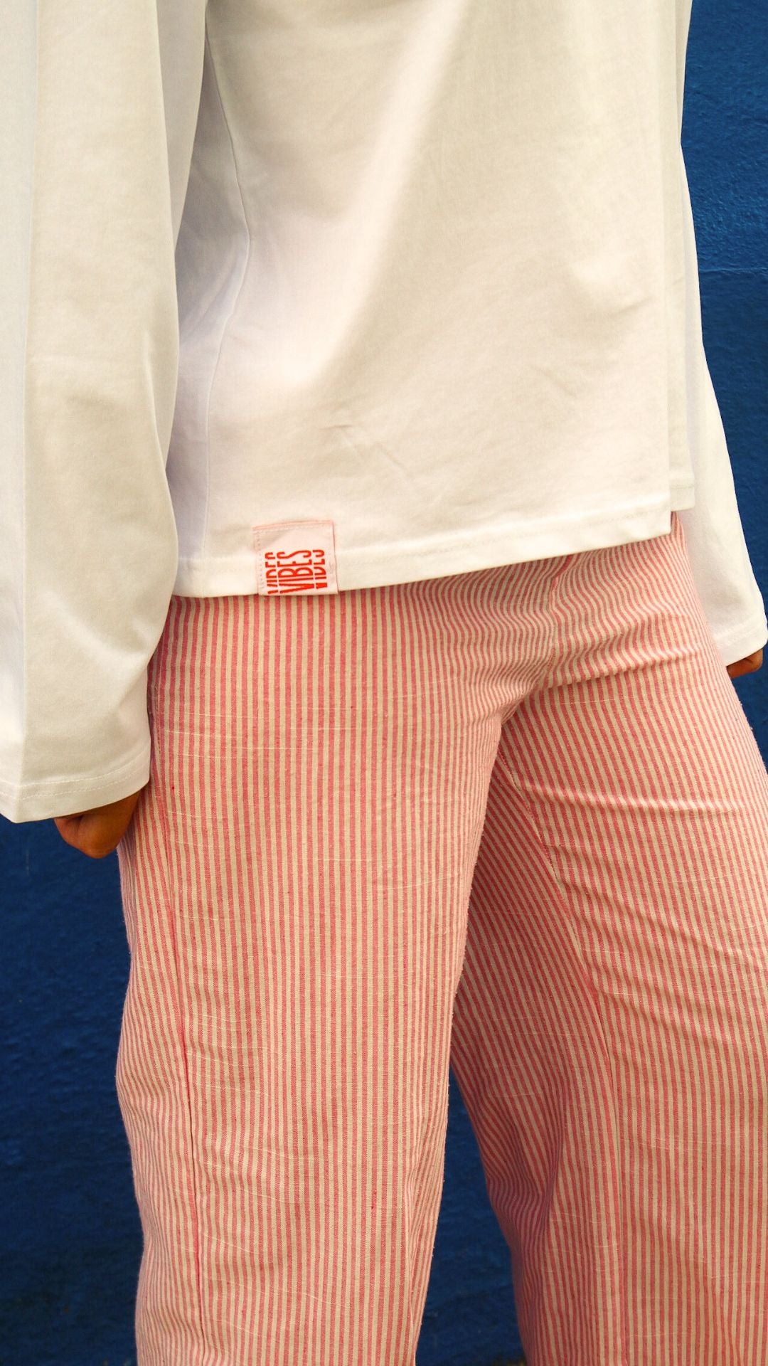 Our Tres Vibes Women's Pink Striped Trousers are lightweight and have a relaxed fit and elasticated waist. 100% Cotton canvas.