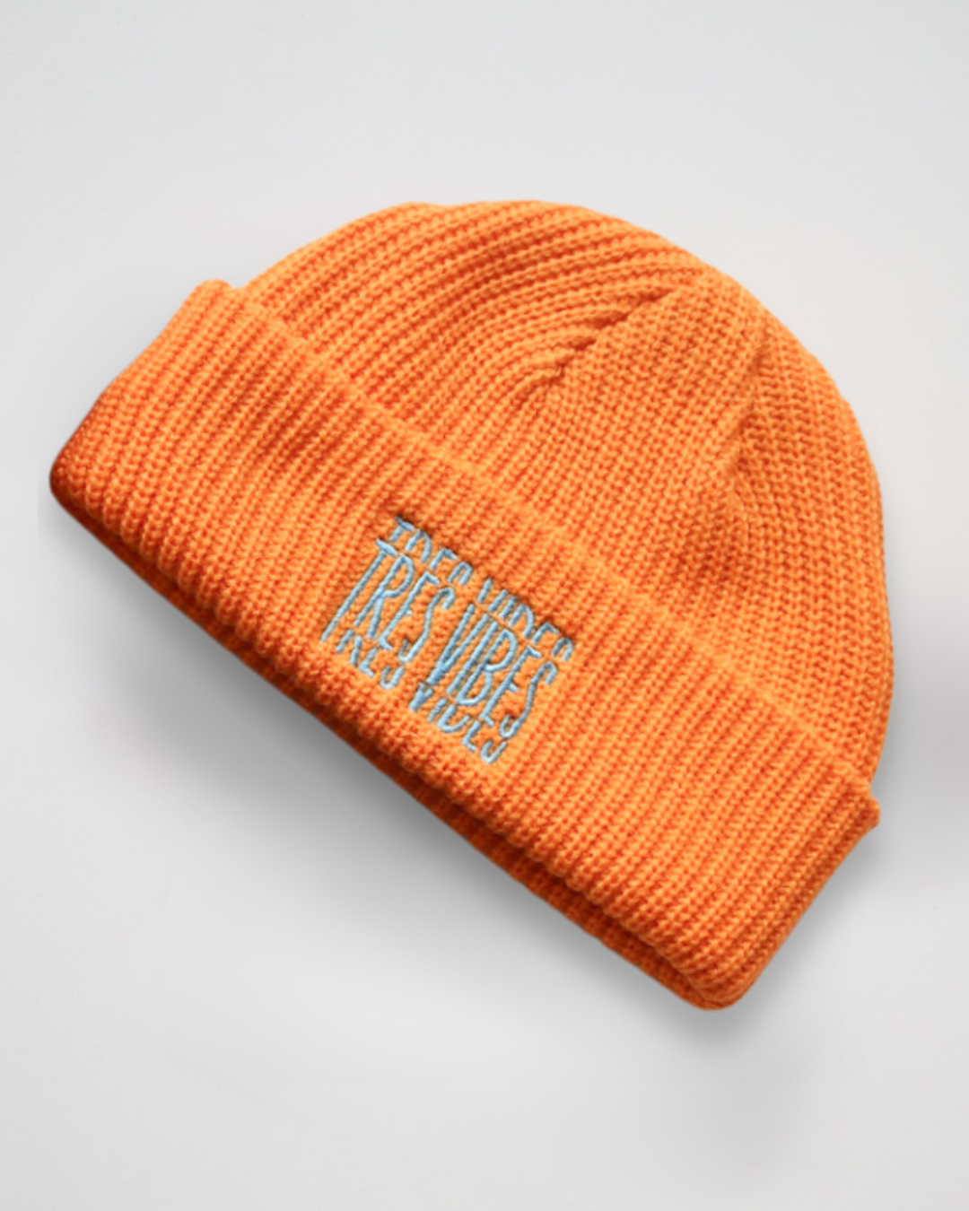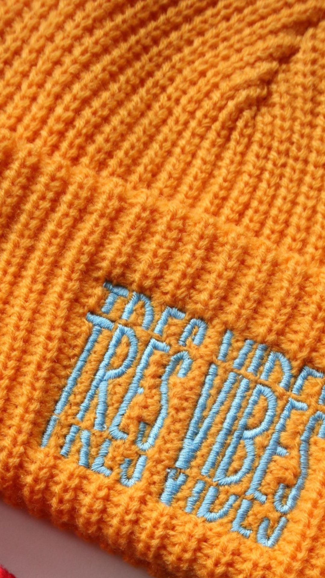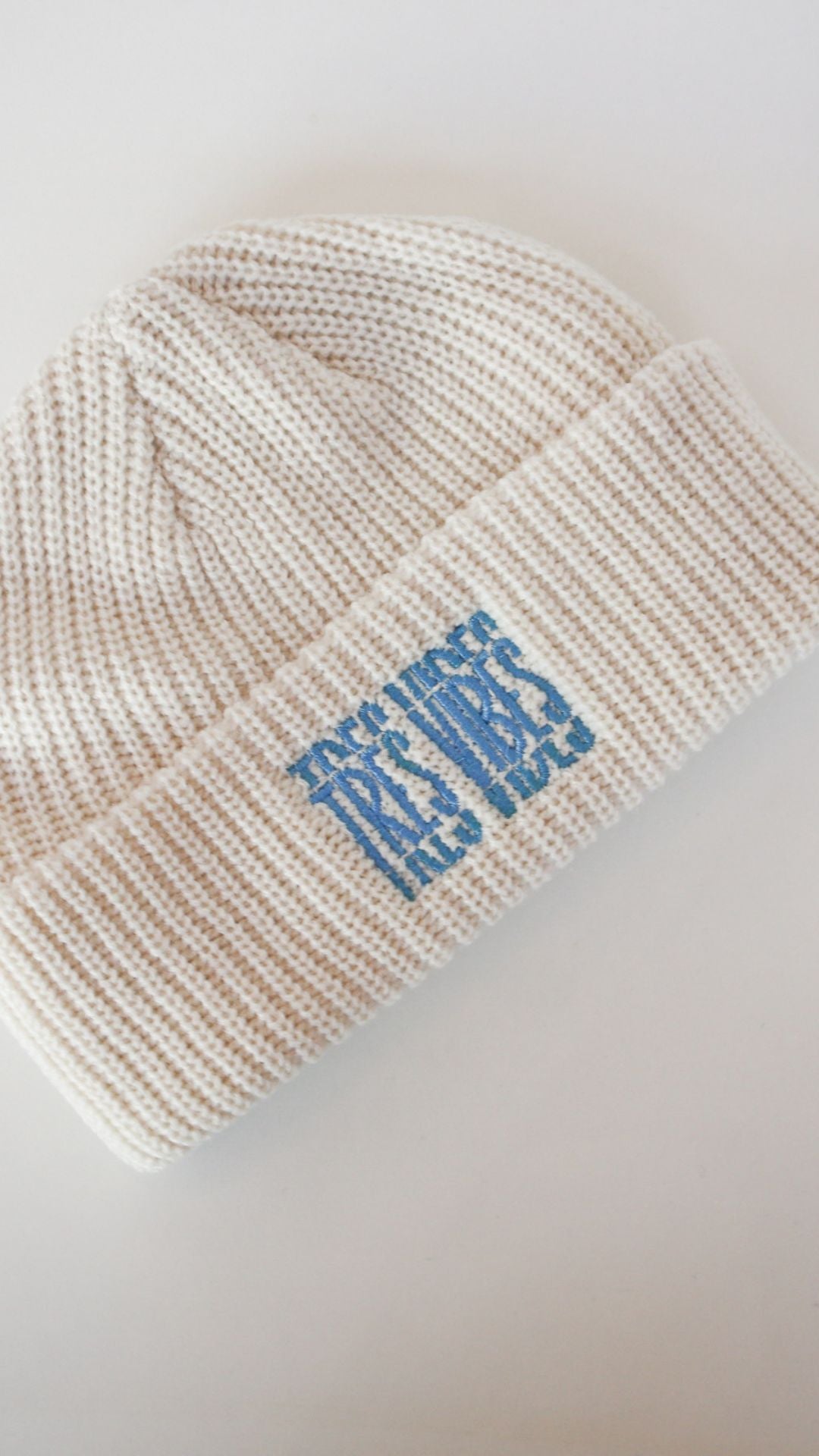 Our embroidered Tres Vibes fisherman-style beanie comes in three statement colours with blue embroidery front central. It has a snug and comfortable fit and one size fits most.